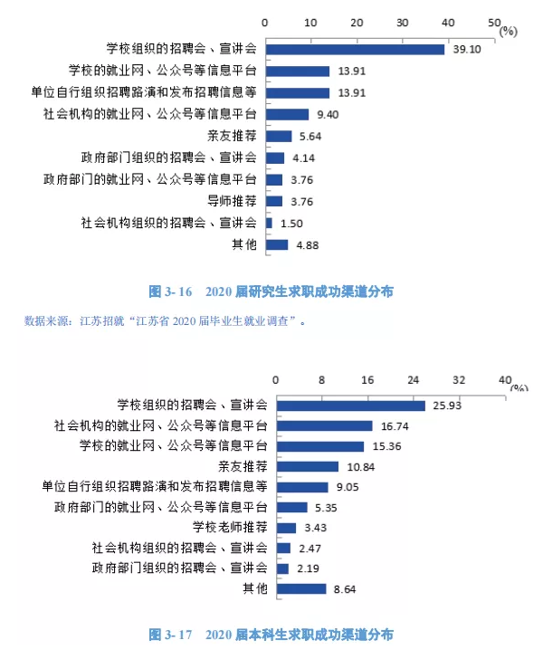 5、求职成功渠道:“学校组织的招聘会、宣讲会”为学校 2020 届毕业生获得第一 份工作的主要渠道;占比分别为研究生 39.10%、本科生 25.93%。其次,研究生就 业的主要渠道为“学校的就业网、公众号等信息平台”和“单位自行组织招聘路演 和发布招聘信息等”(均占比 13.91%)、本科生的主要就业渠道为“社会机构的就 业网、公众号等信息平台”(占比 16.74%)。