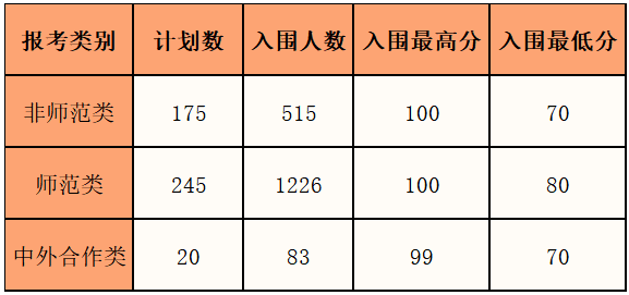 专业投档办法:按照非师范类、师范类、中外合作类各类计划数1:1分别划定校内投档基准线,按“分数优先,平行志愿”的原则择优录取,专业间不设级差分。当考生综合成绩无法满足其所填报的专业志愿时,如果考生服从专业调剂,学校根据综合成绩从高分到低分调剂到招生计划未满专业(必须符合专业的选考科目要求);如仍不足,则从投档基准线下考生中从高分到低分逐一择优录取到未满专业(必须符合专业的选考科目要求),直至满额。