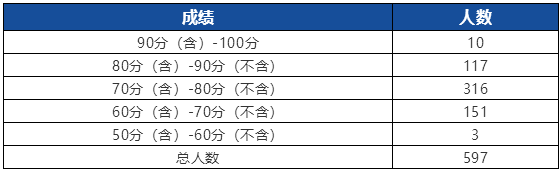 此次综合测试成绩为笔试和面试成绩总和,分别占75%和25%。其中,最高分为95,最低分58,平均分为74.4。综合测试成绩分段表如下: