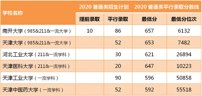 天津总共有6所双一流高校(2所985、4所211、2所一流大学、6所一流学科),6所高校2020年在浙江普通类有招生计划,计划招生340人(普通类提前10人、普通类平行330人),除天津中医药大学护理学类专业外,其他高校及专业均在第一段完成了录取。今天小编汇总了这些高校2020年在浙江的普通类录取情况,供大家参考。