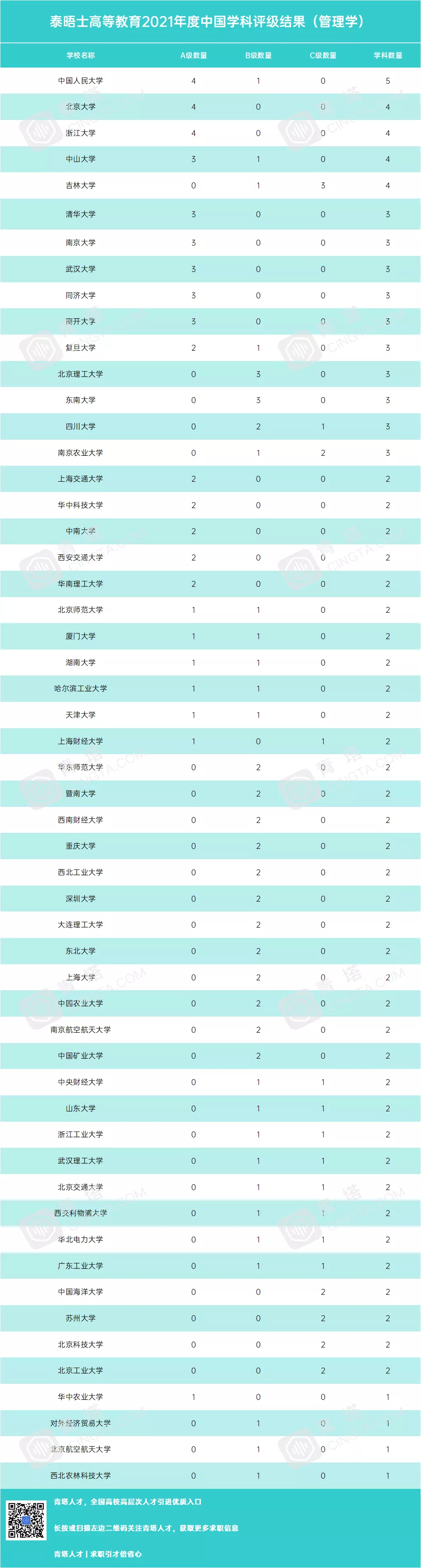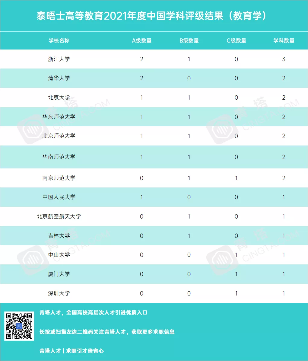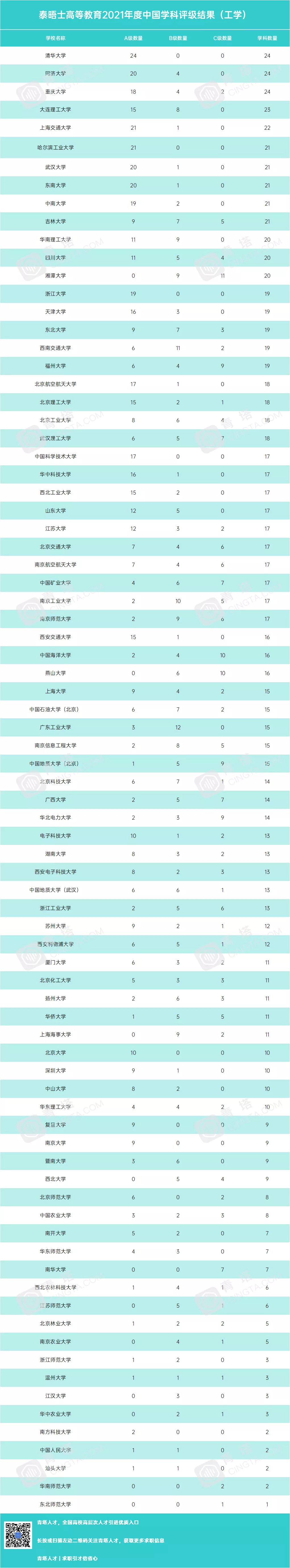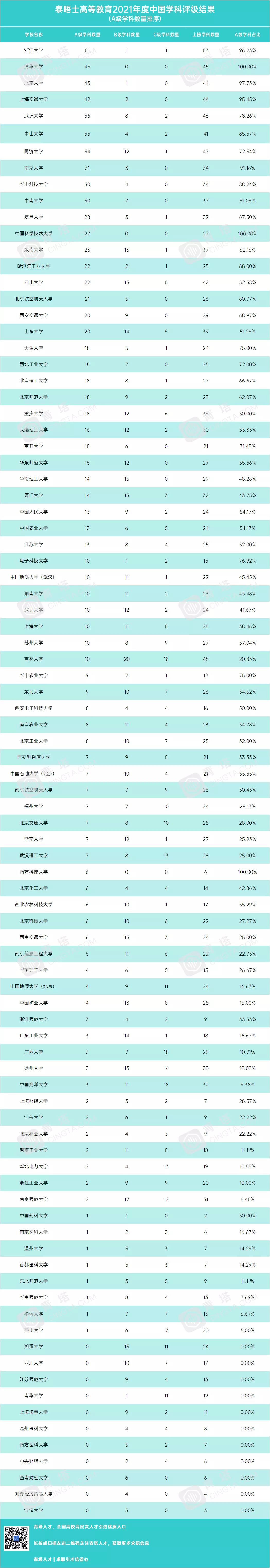 据统计,所有高校中,浙江大学A级学科数量最多,有51个,A级学科占比96.23%;清华大学次之,共有45个A级学科,且所有上榜学科均为A级学科。