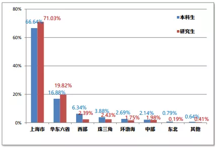 ①签约就业本科毕业生中,在上海市就业的占66.64%, 到华东六省(苏、浙、皖、闽、赣、鲁)就业的占 16.88%。