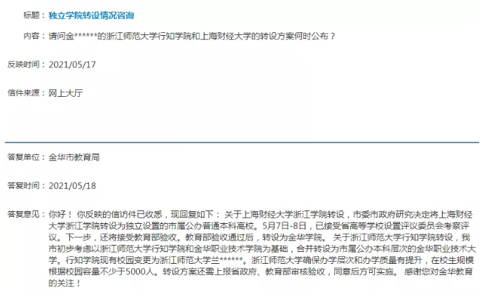 根据金华市教育局的最新回复,上海财经大学浙江学院、浙江师范大学行知学院将转设为独立设置的市属公办普通本科高校。