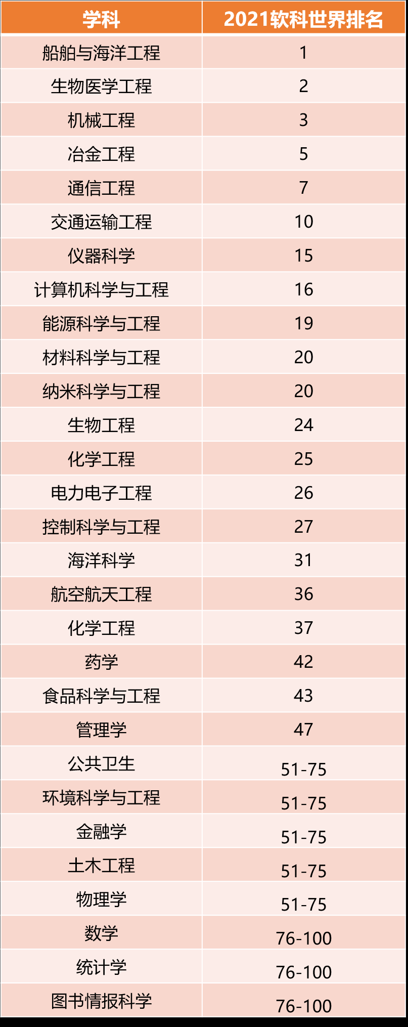 2021软科世界一流学科排名中,上海交通大学6个学科(船舶与海洋工程、生物医学工程、机械工程、冶金工程、通信工程、交通运输工程)排名世界前10,学科数量位居全国内地高校第二,其中船舶与海洋工程位居世界第一。21个学科排名世界前50,其中管理学位居内地高校第一,海洋科学位居内地高校第二,药学位居内地高校第二,计算机科学与工程位居内地高校第三。29个学科排名世界前100,其中公共卫生位居内地高校第1-3名,金融学位居内地高校第1-2名。