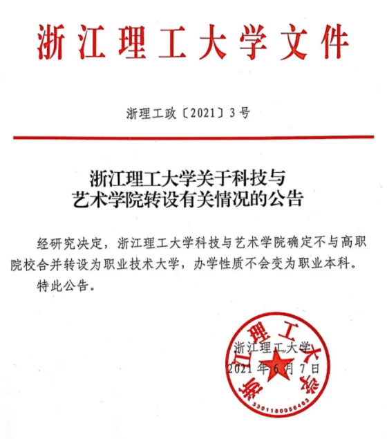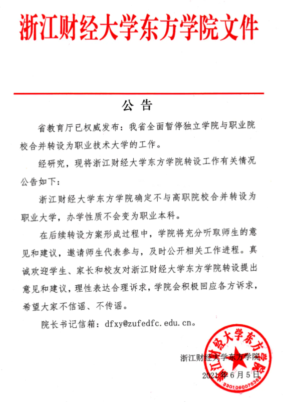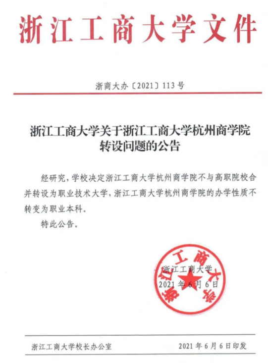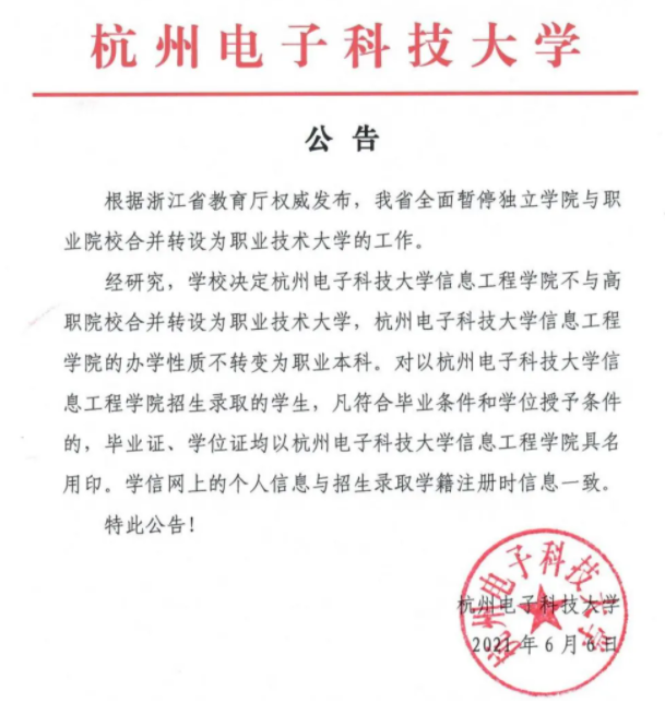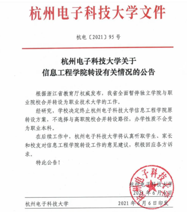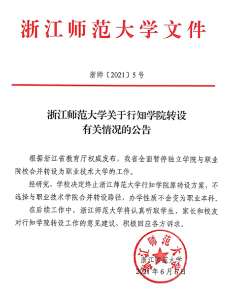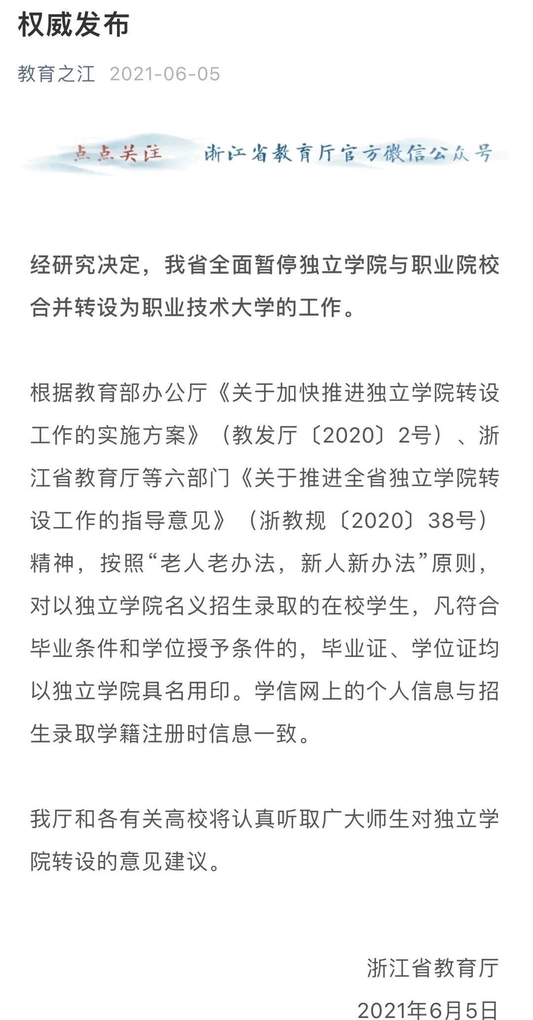 6月5日晚,浙江省教育厅官方微信公众号“教育之江”发布题为《权威发布》的消息,浙江省全面暂停独立学院与职业院校合并转设为职业技术大学的工作。