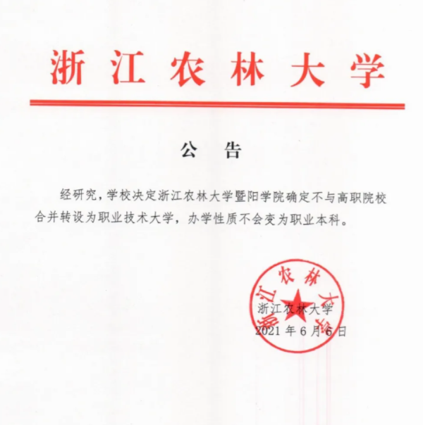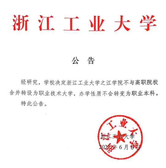近日,浙江工业大学、浙江师范大学、浙江理工大学、浙江工商大学、浙江财经大学、浙江农林大学、杭州电子科技大学分别发布公告表示,确定不与高职院校合并转设成为职业技术大学。公告指出,浙江工业大学之江学院、浙江师范大学行知学院、浙江理工大学科学与艺术学院、浙江工商大学杭州商学院、浙江财经大学东方学院、浙江农林大学暨阳学院、杭州电子科技大学信息工程学院的办学性质不会变为职业本科。