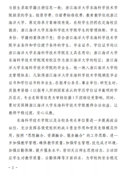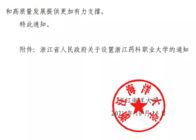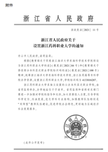 10月16日,浙江海洋大学发布关于转发《浙江省人民政府关于设置浙江药科职业大学的通知》的通知,浙江海洋大学东海科学技术学院与浙江医药高等专科学校正式合并转设为浙江药科职业大学。