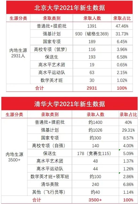 清华北大2021级新生大数据:强基计划占比30%,普通批加提前批不到一半