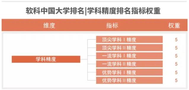 学科精度是2021软科中国大学排名的35个评价维度之一,归属于学科水平模块。其排名对象是被纳入2021软科中国大学排名且有学术型硕士点的高校(不含艺术类高校)。学科精度排名在一定程度上反映了当前我国“高精尖”大学的排列格局。学科精度维度的指标体系和权重如下: