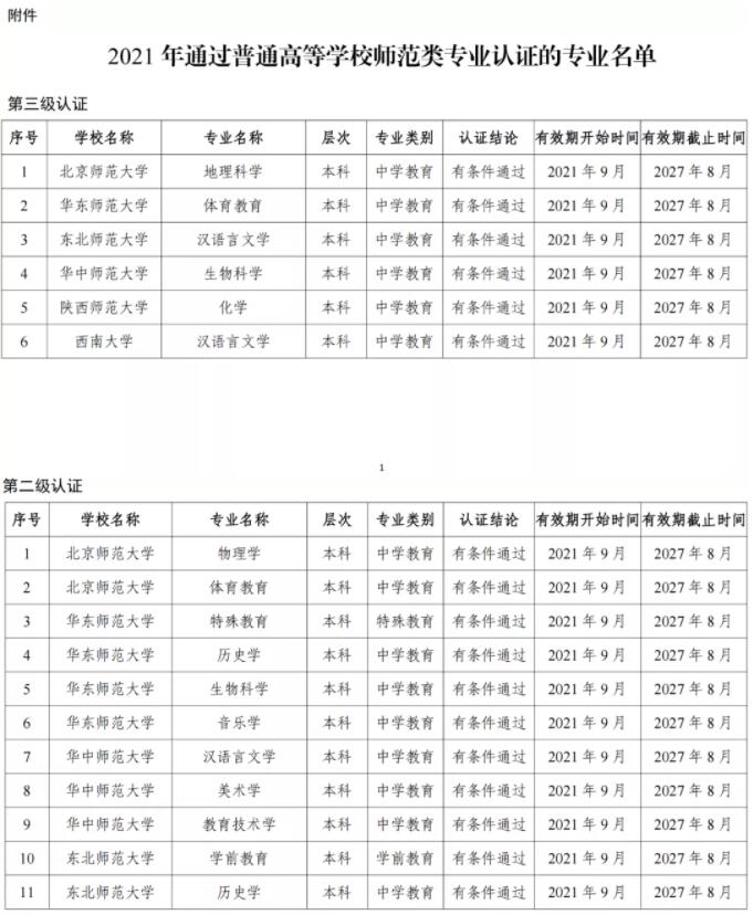 教育部官网发出《教育部办公厅关于公布2021年通过普通高等学校师范类专业认证专业名单的通知》,来自6所高校的6个专业通过第三级专业认证,140所高校的256个专业通过第二级专业认证。