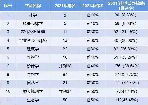 10月25日,软科2021年“中国最好学科”排名公布,我校11个学科上榜,上榜学科数较2020年增加2个,其中林学、风景园林学两个学科跻身前10%。