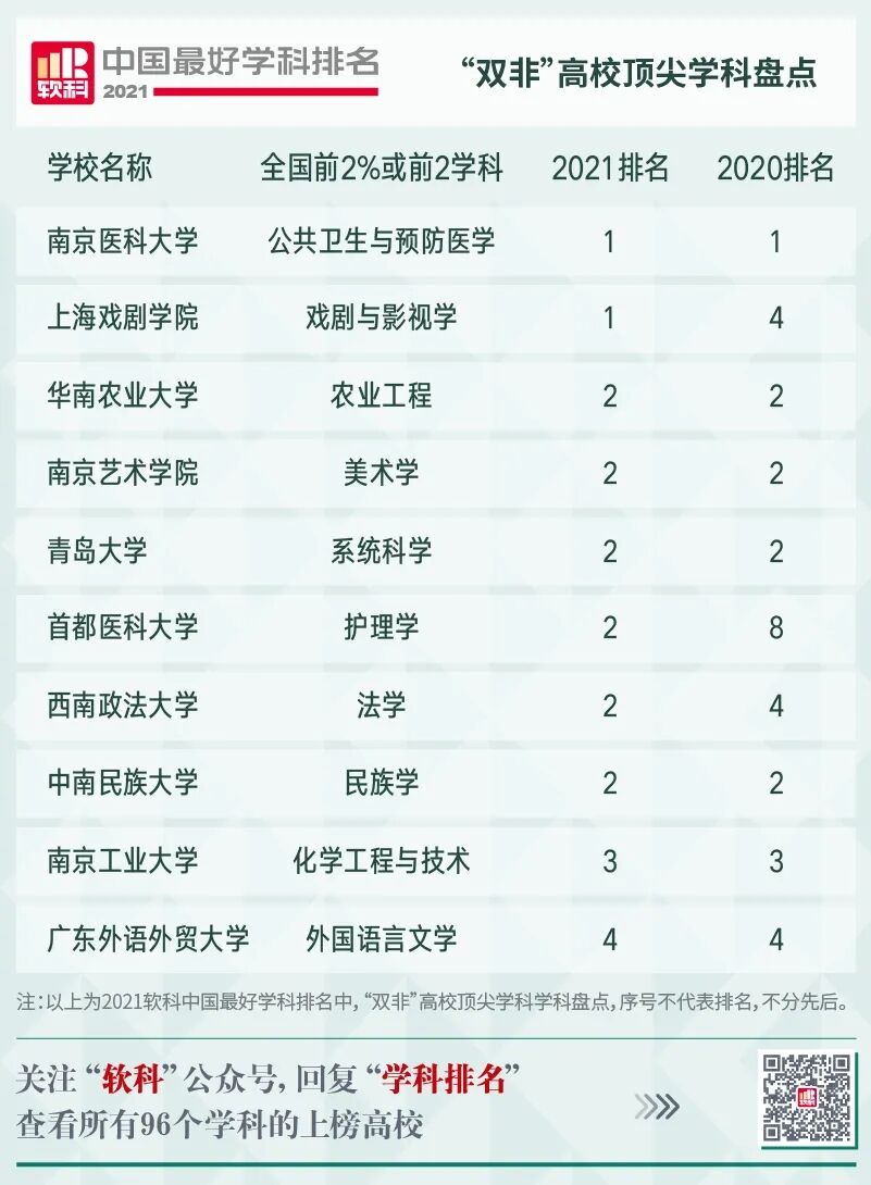除了上榜数量之外,“双非”高校所拥有的顶尖学科数量,更能展示高校的学科优势。在“双非”高校中,有两所院校做到了顶尖学科领跑全国,分别是南京医科大学和上海戏剧学院。