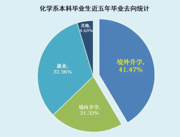 南方科技大学化学系2017届至2021届共有本科毕业生258名。毕业去向主要涵盖境外自主升学、境外联培、国内保研考研、企事业单位、科研机构及知名医药企业等方向。其中,境外升学占比41.47%,境内升学占比21.32%,选择就业占比32.56%。