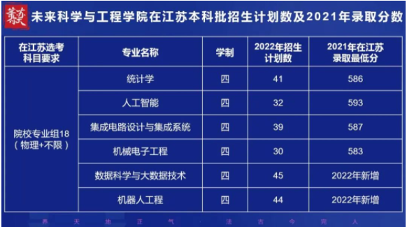 2022年,未来校区未来科学与工程学院6个专业在江苏招生单列院校专业组,选考科目要求为物理+不限,各专业招生计划及历年分数如下图。