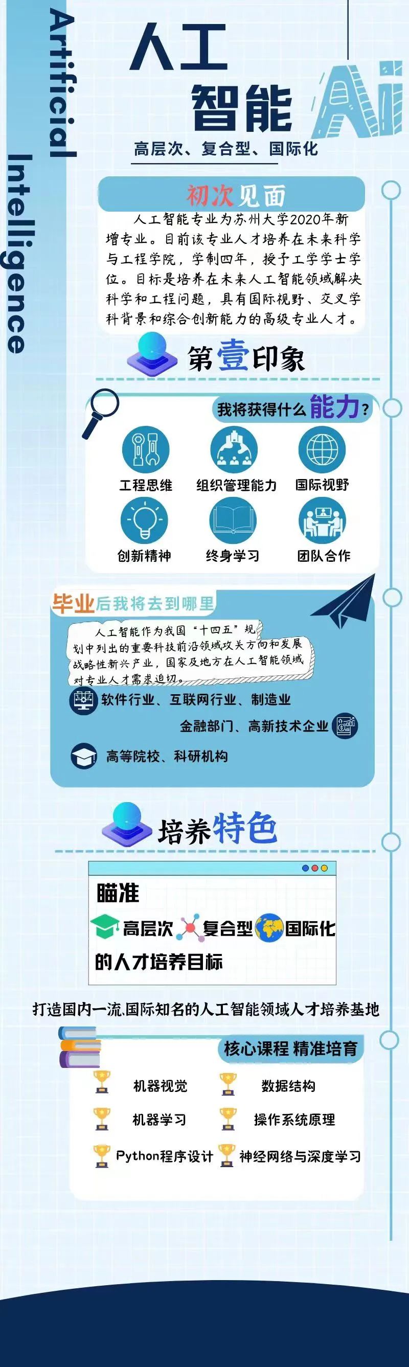 专业前景:人工智能作为我国“十四五”规划中列出的重要科技前沿领域攻关方向和发展战略性新兴产业,在新的时代背景下,已成为人才培养的重要方向。学院紧跟时代步伐,以新工科培养理念为指引,充分利用和综合多学科优势,开设人工智能专业,致力培养人工智能领域科技研究型和产业应用型人才,以满足国家及地方在人工智能领域对专业人才的迫切需求。
