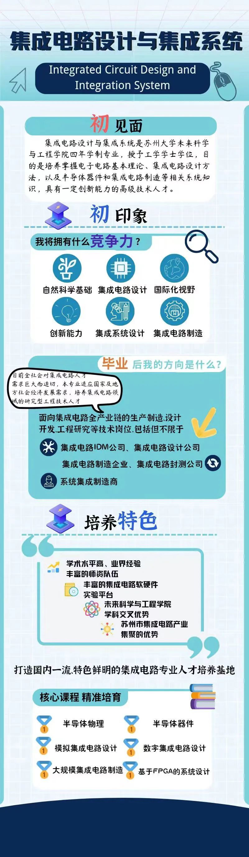 专业前景:本专业培养适应国家及地方社会经济发展需求,具有扎实的自然科学基础,掌握集成电路设计、集成电路制造以及集成系统设计等方面的基本原理、专业技能与研究方法,具有社会责任感、国际化视野、沟通能力、创新能力及团队合作精神,能够在集成电路专业领域从事科学研究、技术开发、系统设计和项目管理等工作的研究型工程技术人才。