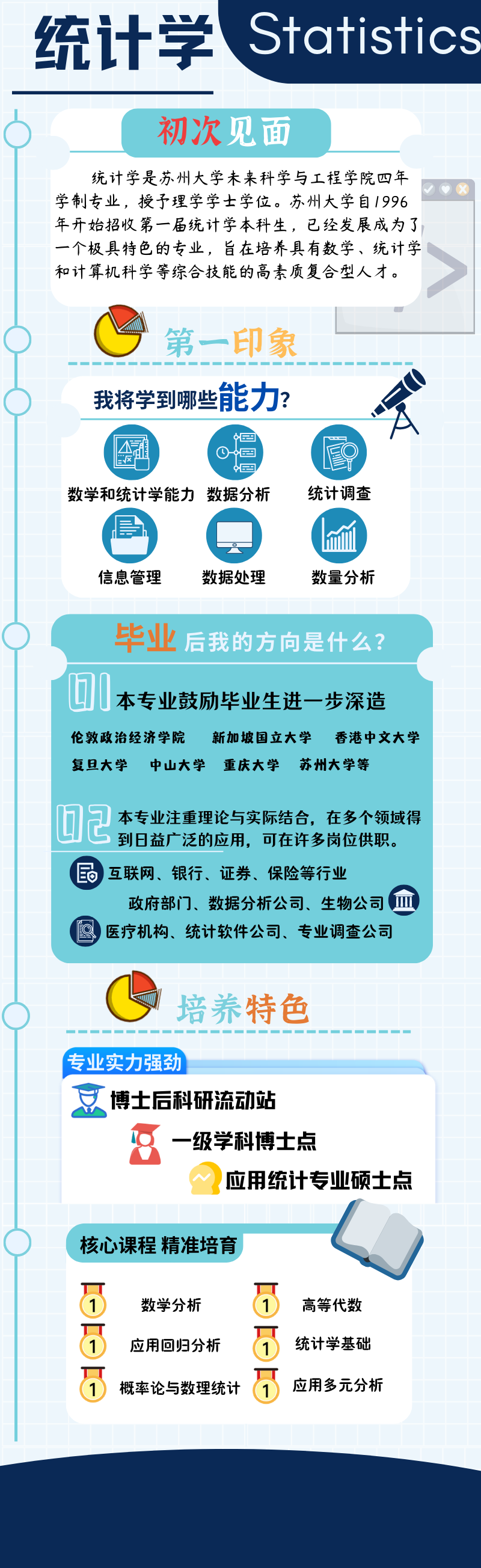 专业前景:除直接就业外,本专业鼓励毕业生进一步深造。统计专业历届本科生中不少学生在伦敦政治经济学院、华威大学、新加坡国立大学、谢菲尔德大学、澳大利亚新南威尔士大学、中山大学、香港理工大学、香港中文大学、复旦大学、中国人民大学、北京师范大学、华东师范大学、重庆大学、西安交通大学、苏州大学等高校深造。