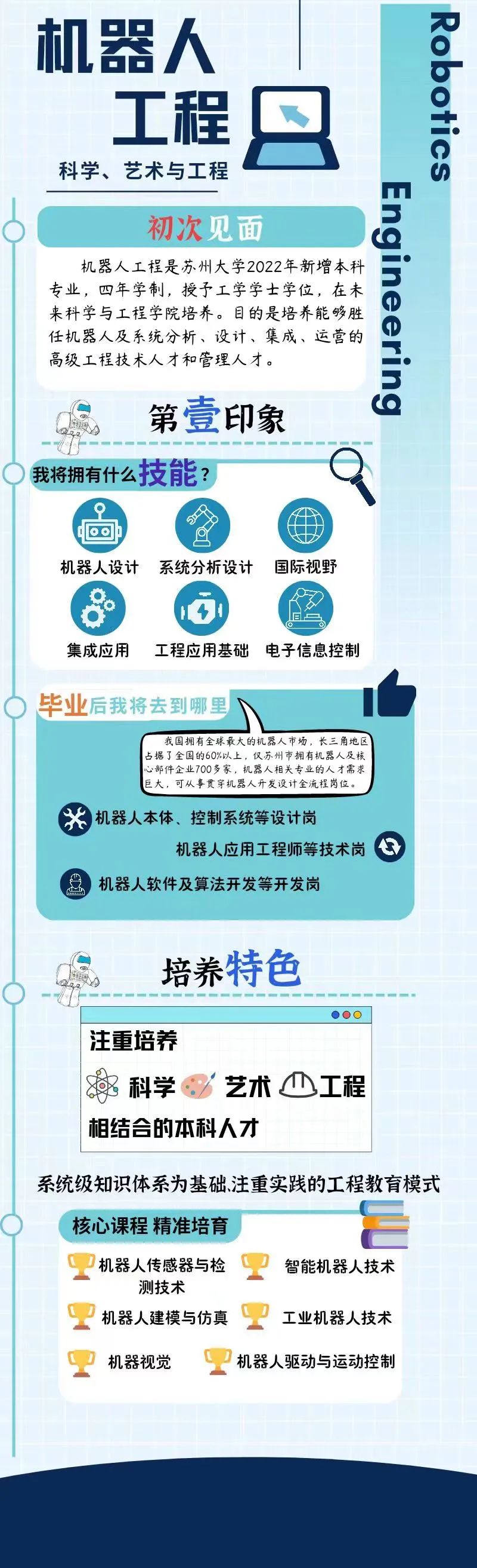 专业前景:机器人作为国家战略在持续推进发展,我国也是全球最大的机器人市场,而长三角地区占据了全国的60%以上,仅苏州市拥有机器人及核心部件企业700多家,机器人相关专业的人才需求巨大。