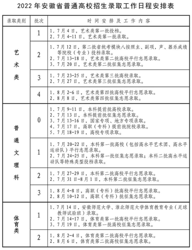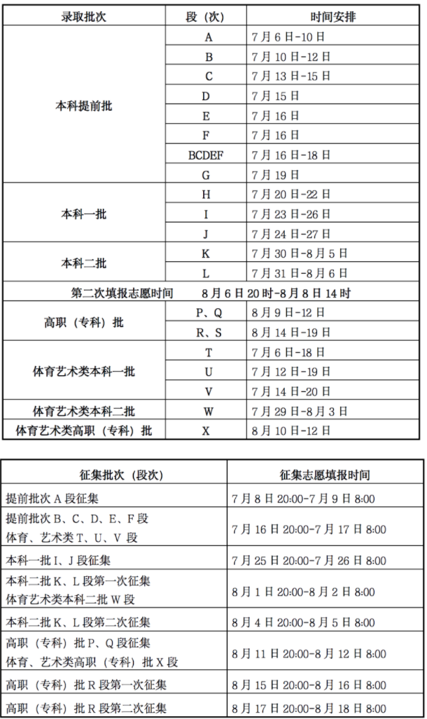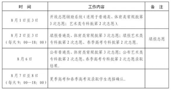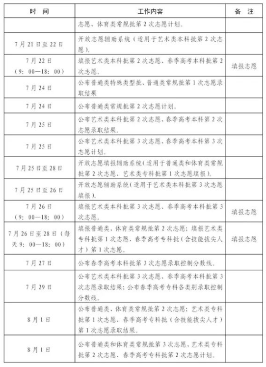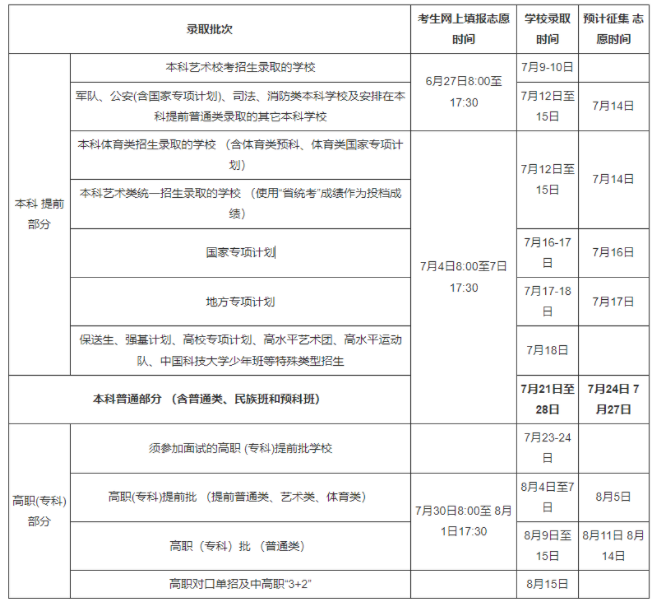 (四)第二批本科(文理类,体育类,三校生文理类)录取:7月24日-8月1日;艺术类本科平行志愿录取:7月19-23日;艺术类本科单志愿、三校生本科录取:7月25-30日;