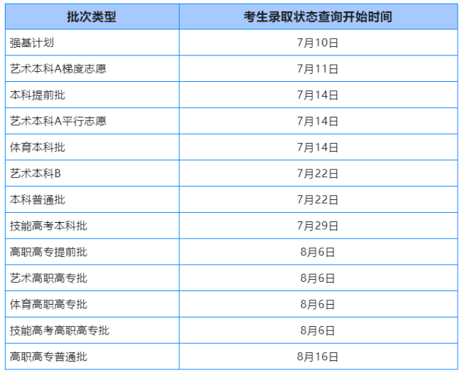 本科提前批次:7月8日-17日录取(其中艺术类分为3小批);