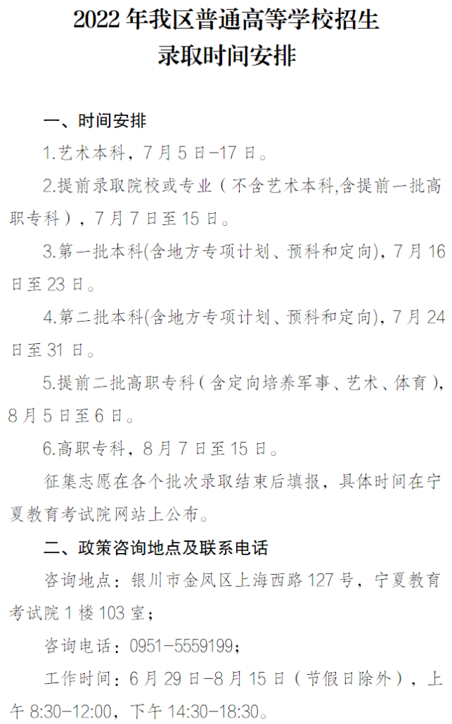 普通类本科批次A阶段及艺术类、体育类本科批次征询志愿填报时间:7月22日至7月23日;志愿填报结束后即进行投档录取,7月下旬公布录取结果。