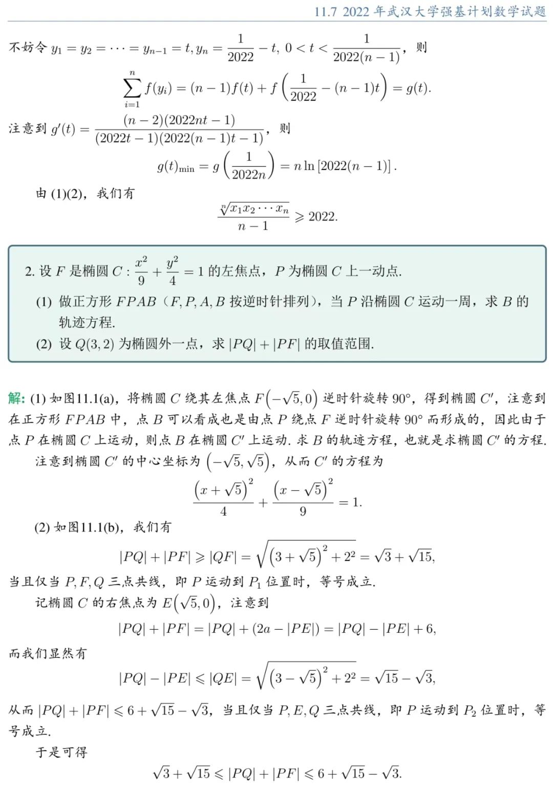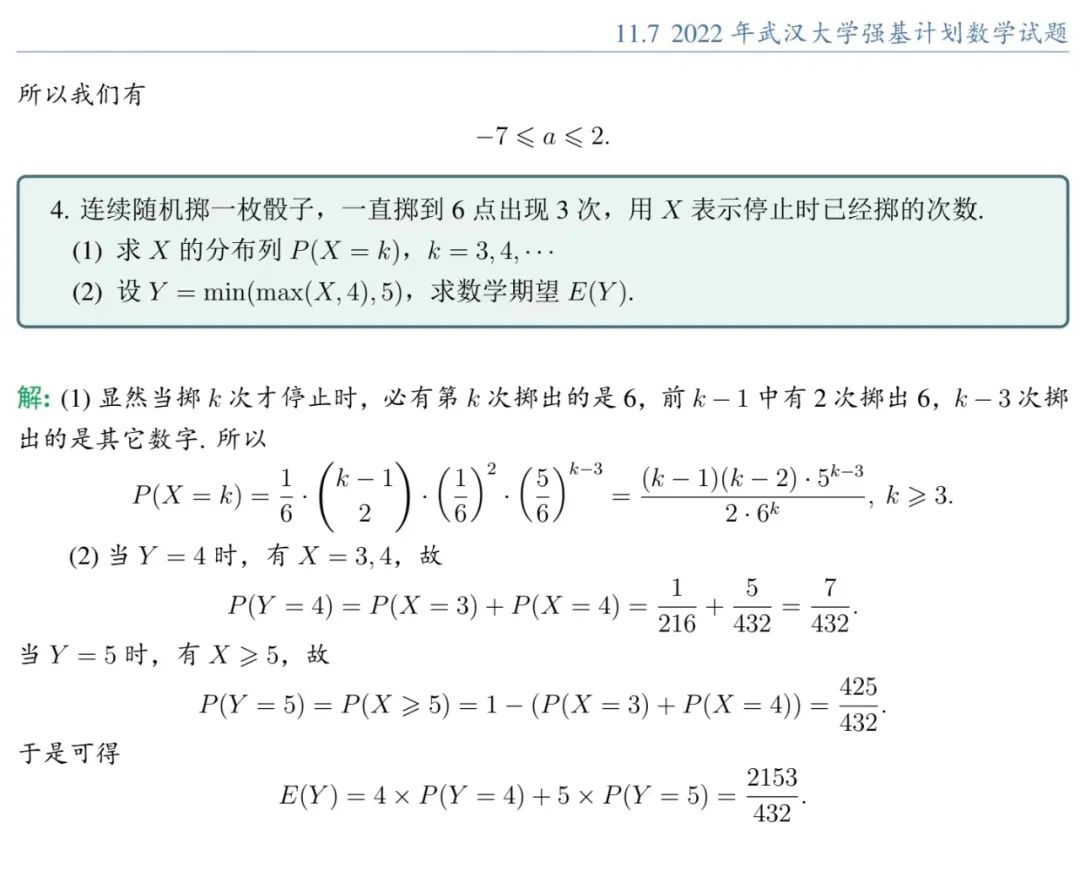 武汉大学2022年强基计划笔试数学试题解析