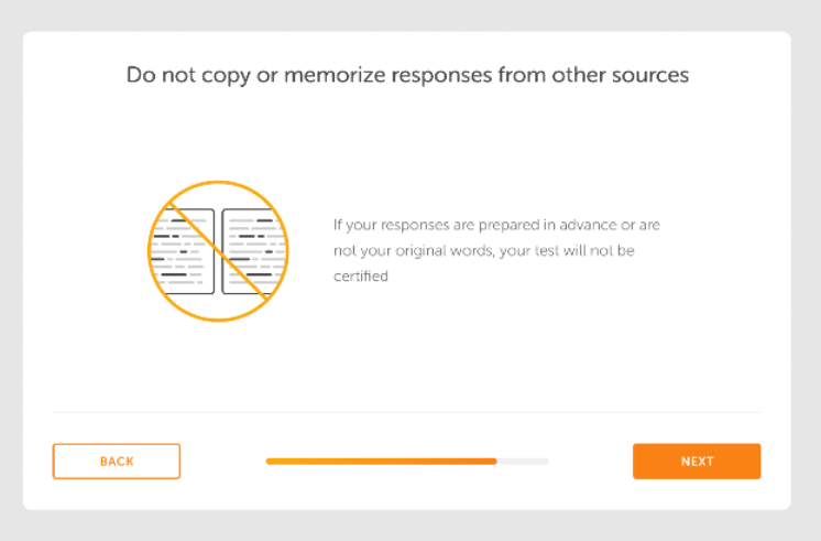 同时,多邻国英语测试也加入了全新的考试引导界面,帮助大家在明确规则内容的同时,能够严格执行规范,避免违规行为的发生。