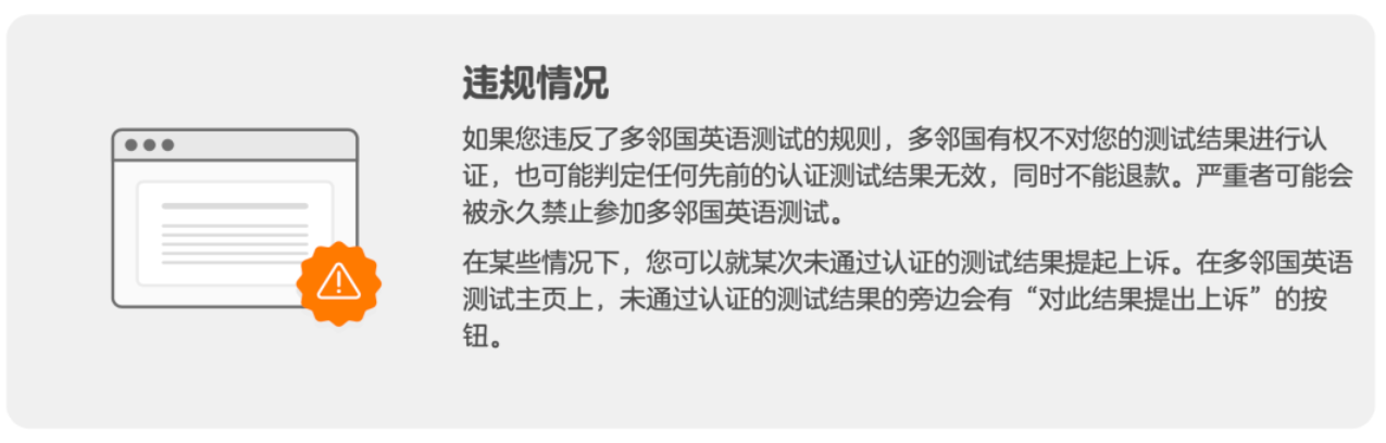 为了维护真实健康的学术环境,多邻国英语测试与海外高校的学术要求保持一致,严格保障测试成绩的完整性。一旦考生在测试过程中被检测到使用和外部内容高度重合的答案,即被判为作弊行为,且不能获得该场考试的认证成绩,请大家务必予以高度重视。