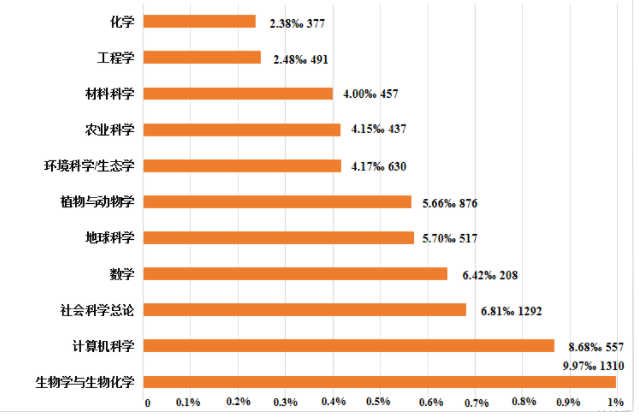 据统计,我校生物学与生物化学在2012年1月1日至2022年4月30日期间共发表论文546篇,总被引次数6723次,篇均被引次数12.31,高被引论文1篇。在进入全球前1%的1314个机构中,我校生物学与生物化学位于第1310名。
