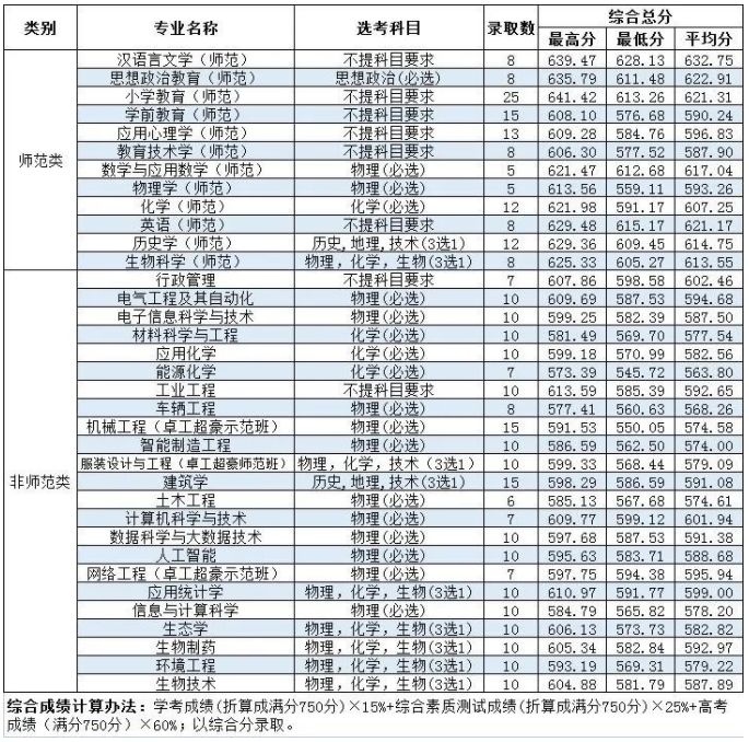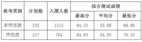 自我推荐入围2054人。通过自我推荐形式获得测试资格的考生共计2054人,其中师范类652人,非师范类1402人。符合章程规定报名条件的考生中,师范类通过书面评审中的最后一名考生学业水平测试各科目折算成绩为125分,A的个数为6个,语数外等第折合分40分,语文A、数学B、外语A,最后同分同排序同入围(其中125分人数为488人,符合要求入围67人)。非师范类通过书面评审中的最后一名考生学业水平测试各科目折算成绩为110分,A的个数为3个,语数外等第折合分35分,语文A、数学C、外语A,最后同分同排序同入围(其中110分人数为692人,符合要求入围329人)。