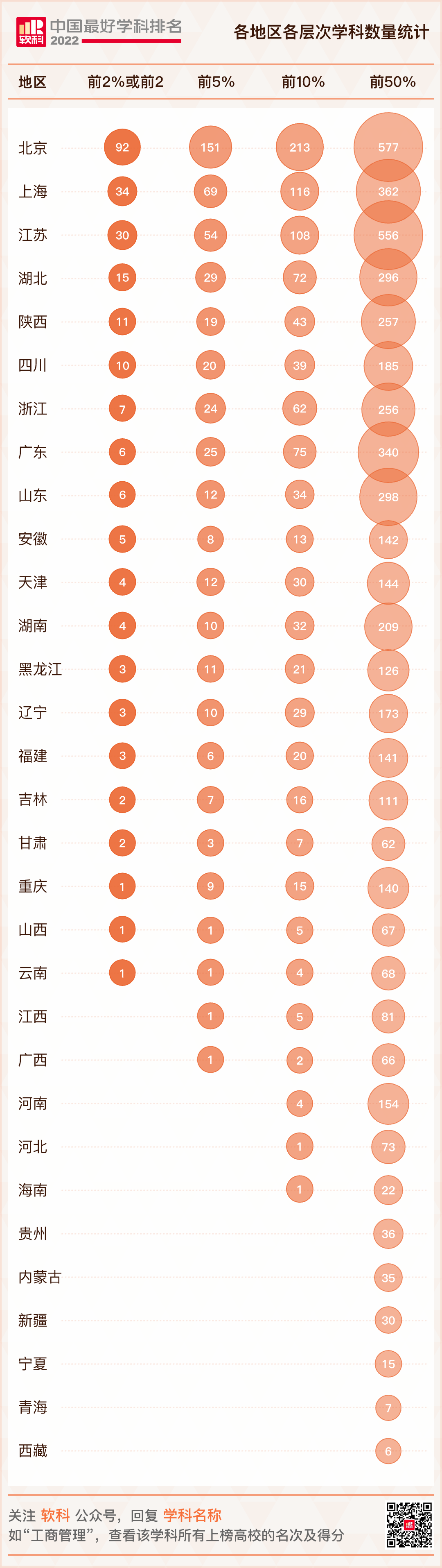 从各省级行政区的上榜学科数量分布看,北京占据绝对优势,在各层次的学科数都高居全国第一。上海的前2名或前2%的顶尖学科数、前5%学科数、前10%学科数均位列全国第二,优势明显。江苏的前50%学科数位列全国第二,彰显了名副其实“高教大省”的整体实力。湖北、陕西、四川等省的顶尖学科数量都处于国内前列。广东、山东、浙江的上榜学科总数优势明显。