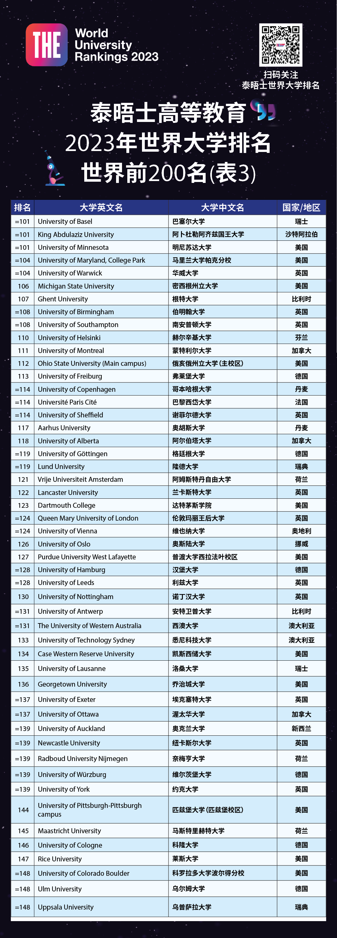 扫描以下二维码查看2023年泰晤士高等教育世界大学排名完整榜单。
