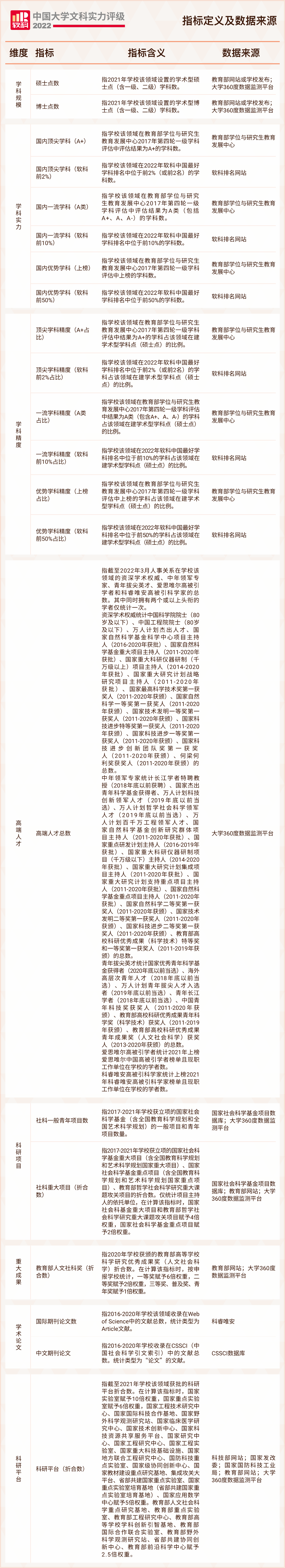 中国大学文科实力评级包含学科规模、学科实力、学科精度、高端人才、科研项目、重大成果、学术论文和科研平台8个维度。相比2020年,今年的文科实力排名新增高端人才和科研平台2个评价维度。
