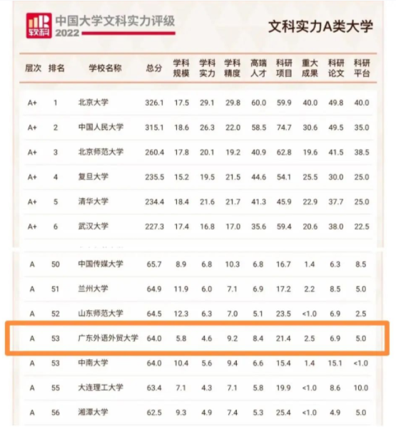 近日,软科发布中国大学文科实力评级,广外位列全国第53名,较上一次排名提升7名,在全国1119所文科领域有得分的高校中排名前5%,位列外语院校第一名。