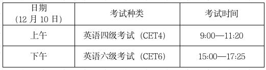 英语四级口语考试(CET-SET4)考试时间为11月19日,英语六级口语考试(CET-SET6)考试时间为11月20日,具体场次安排如下: