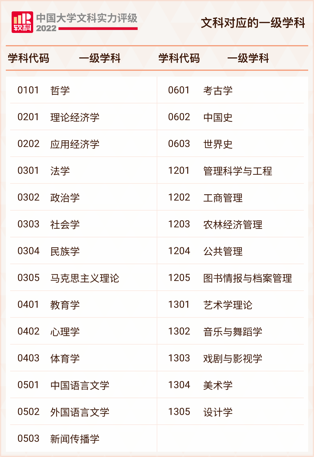 中国大学文科实力评级的对象为所有被纳入2022软科中国大学排名的高校。文科的范围包括8个学科门类的27个学科,具体如下: