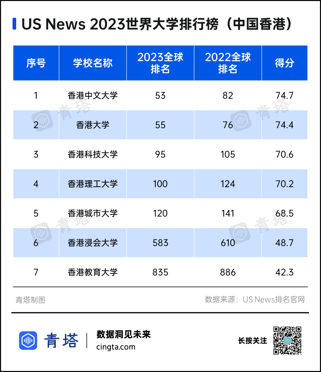 中国香港地区共有7所高校上榜,排名最高的是香港中文大学,居全球53位。