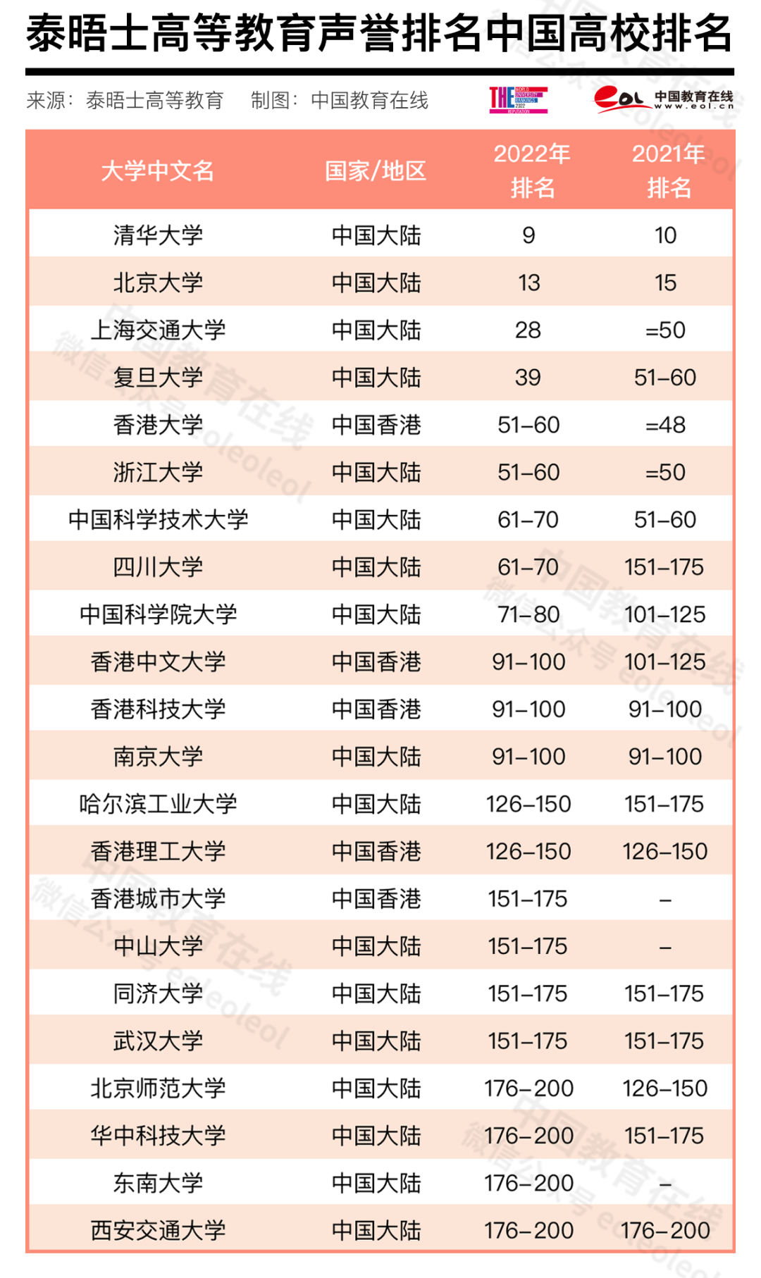 近日,泰晤士高等教育公布了2022年世界大学声誉排名结果,此排名是由高等教育界评选出的世界前200所最负盛名的大学。