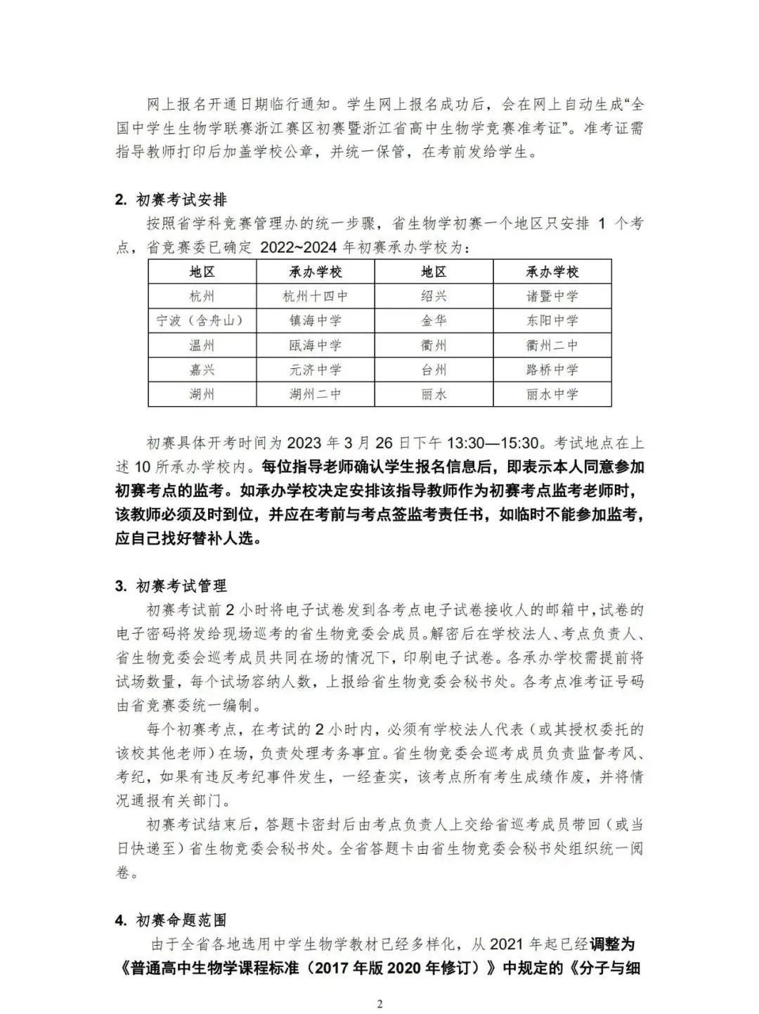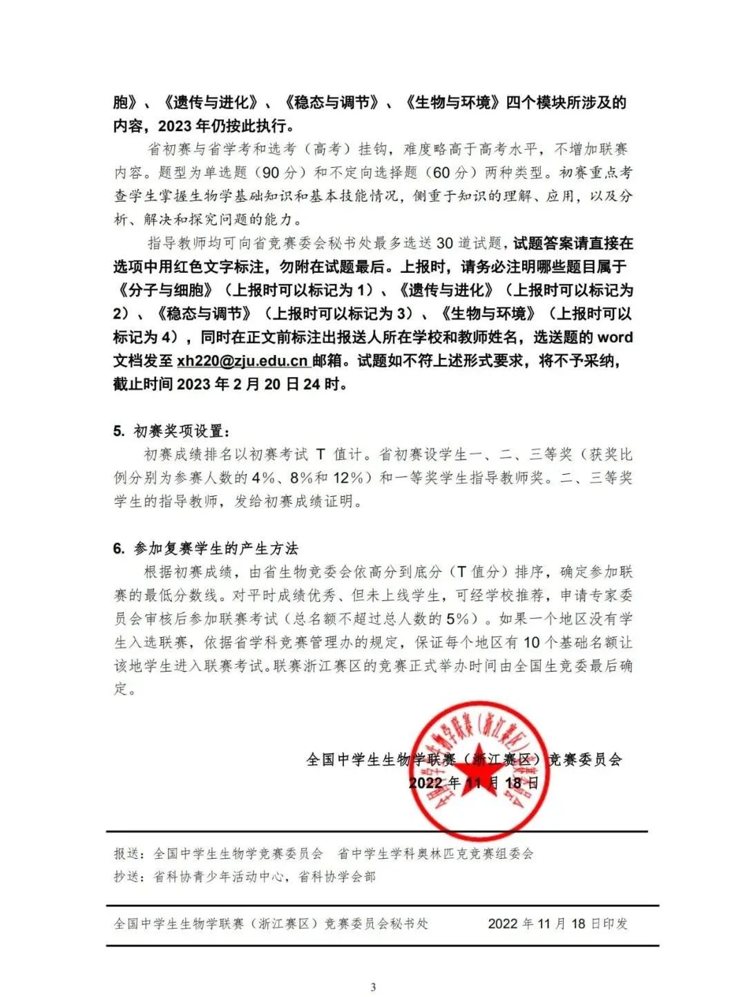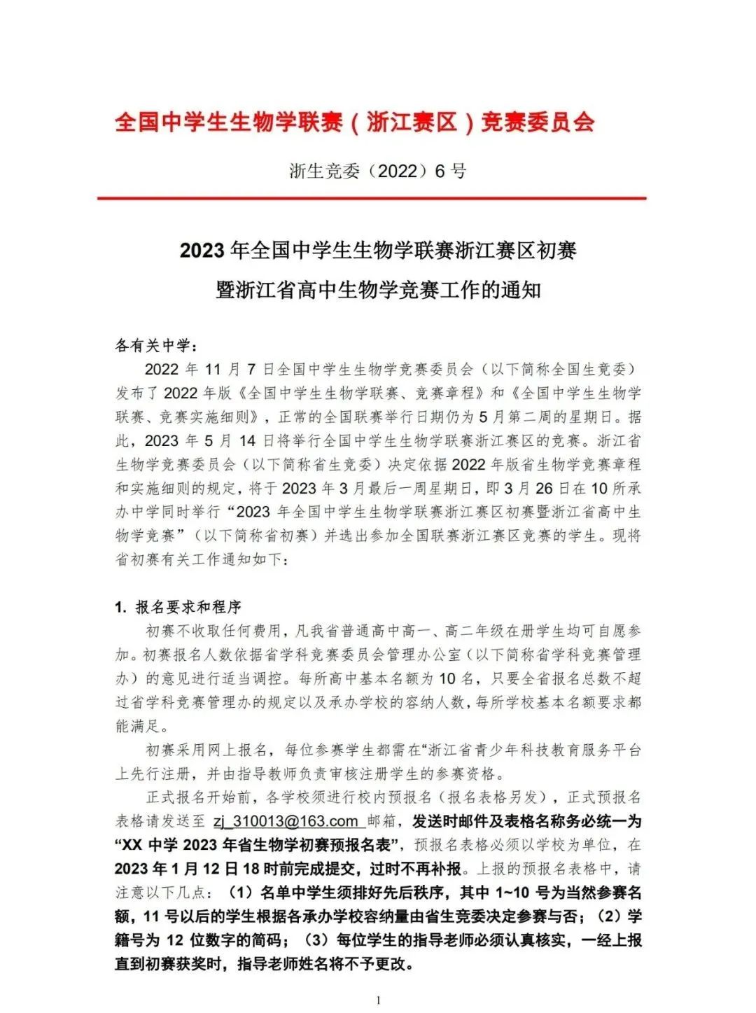 2023年全国中学生生物学联赛浙江赛区初赛通知,将于5月14日举行 发布时间:2022-11-22 10:13:14 阅读量: 浙江省近期发布关于2023年全国中学生生物学联赛浙江赛区初赛通知。通知里表示2023年生物联赛将于5月14日举行。