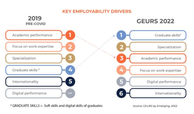 而对于2019和2022年数据的分析显示,在Covid-19全球大流行之后,毕业生技能在这6项中的影响力最高,其次是专业化。学术表现的重要性从第一滑落至第三。