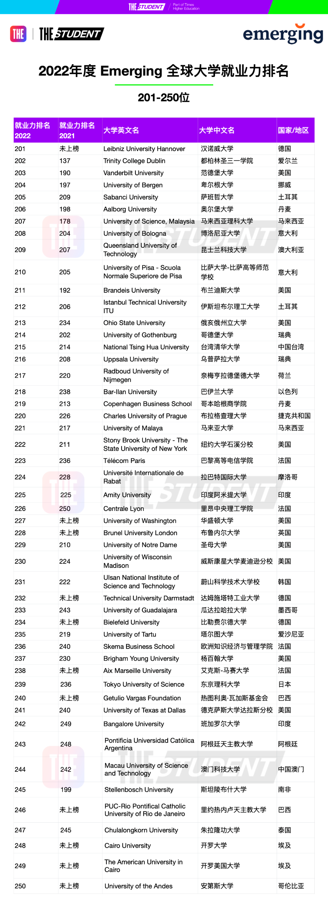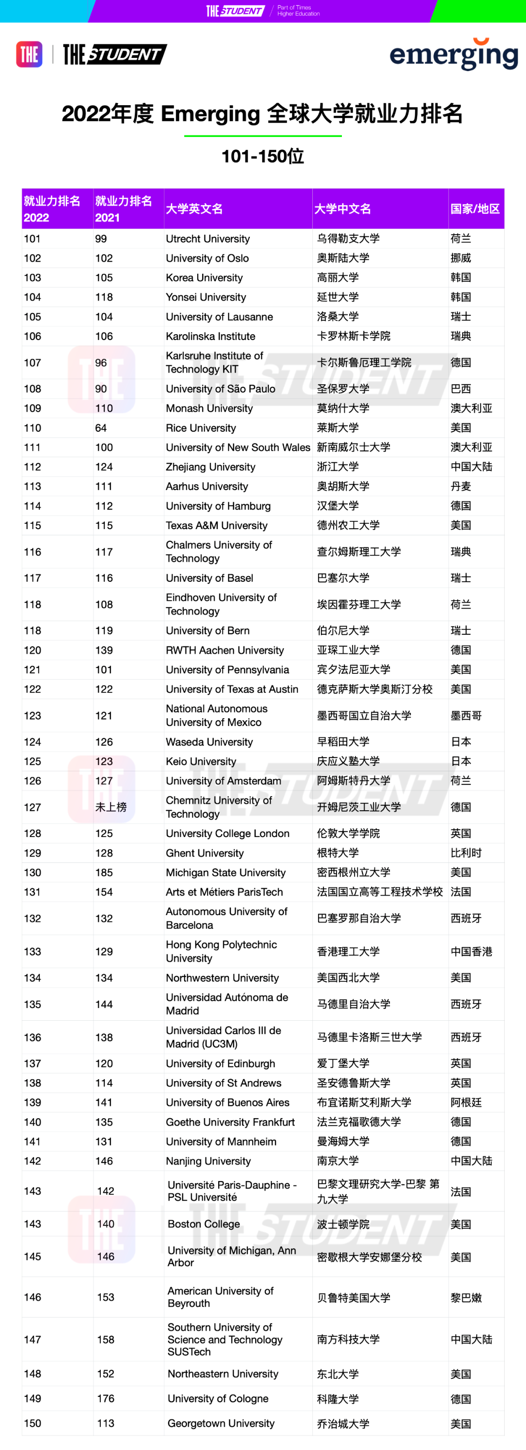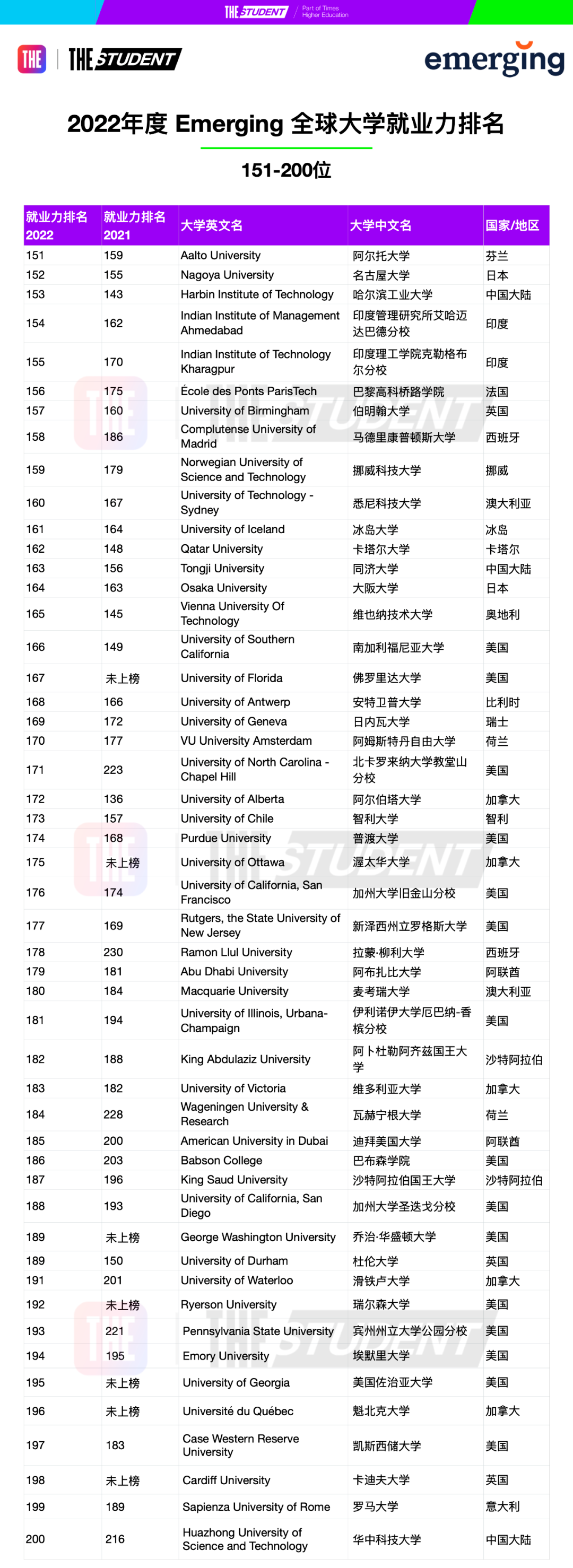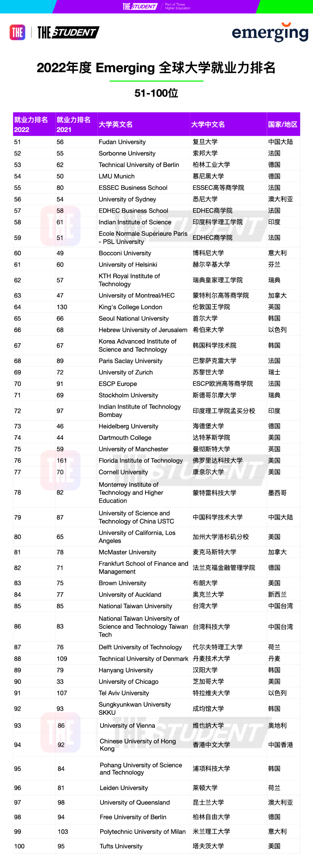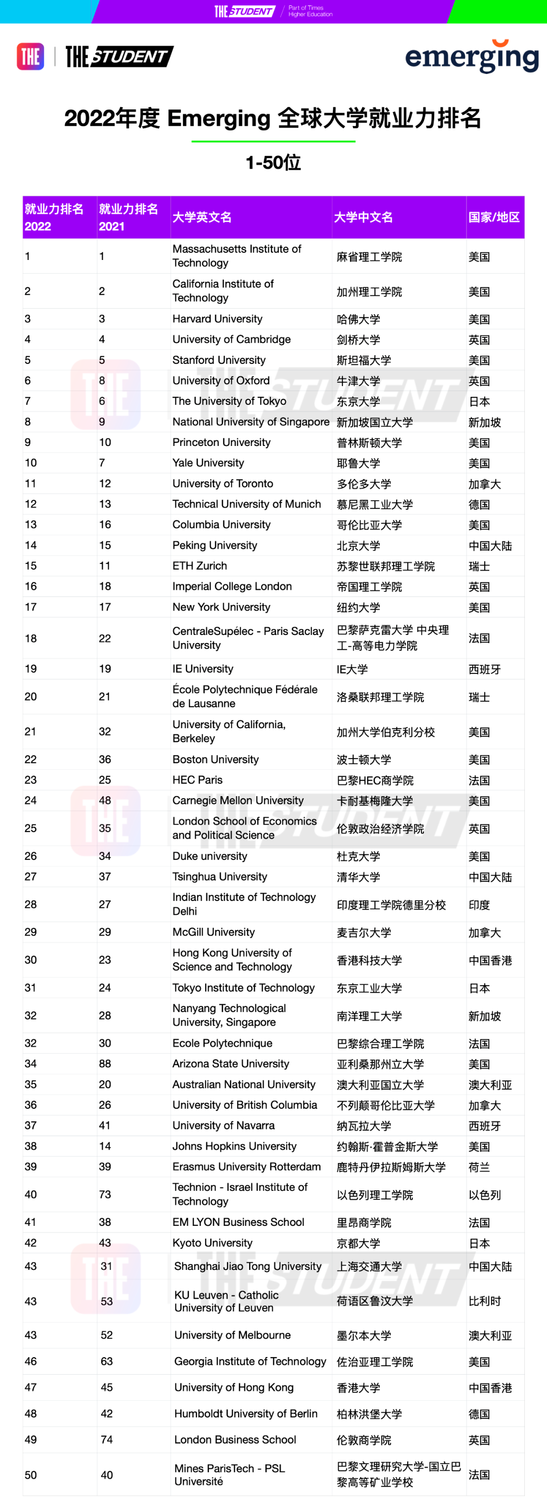 11月24日,由人力资源咨询公司Emerging编制,并由泰晤士高等教育(Times Higher Education, THE) 独家发布的全球大学就业力排名 (Global Employability University Ranking),该排名目前是全球雇主使用率第二高的排名。