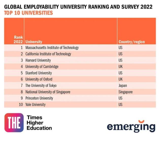 ▲2022年度全球大学就业力排名前10名2022年度全球大学就业力排名由来自24个国家和地区的超过10,000名管理者参与投票,他们每年在全世界内招聘超过80万个面向应届生的全职和大学实习(placement)职位。