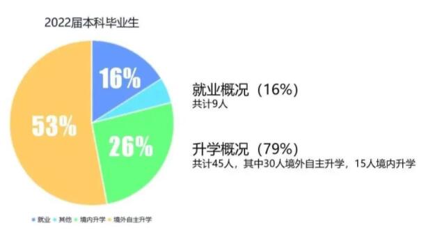 统计与数据科学系2022届本科总毕业人数57人,专业为统计学,共有95%的统计系本科毕业生落实升学就业,16%学生选择就业;79%学生升学,其中30人选择境外自主升学(占比53%),15人选择境内升学(占比26%)。