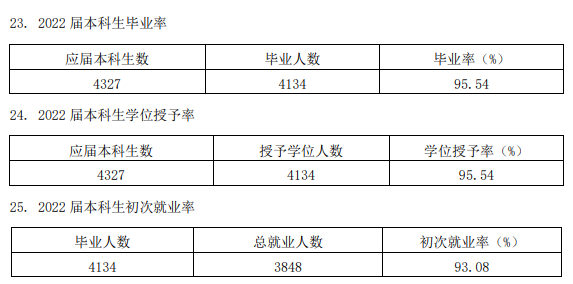 2022届本科生毕业生4327人,4134人顺利完成学业,毕业率为95.54%,学位授予率为95.54%。