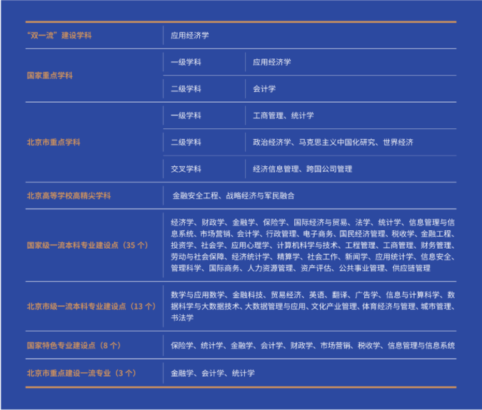 北京市重点学科:应用经济学、法学、企业管理、会计学、世界经济交叉学科、法与经济学、低碳经济学