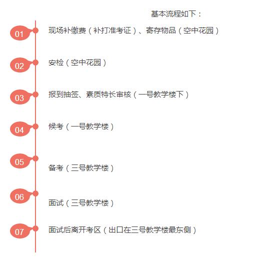 (5)考生报到抽签后,请随即上楼到相应候考室候考,不得离开考区,擅自离开视为弃考。请服从工作人员管理,不得以任何理由妨碍考场秩序、影响工作人员履行职责,对违反面试规定的,将取消面试资格或面试成绩。