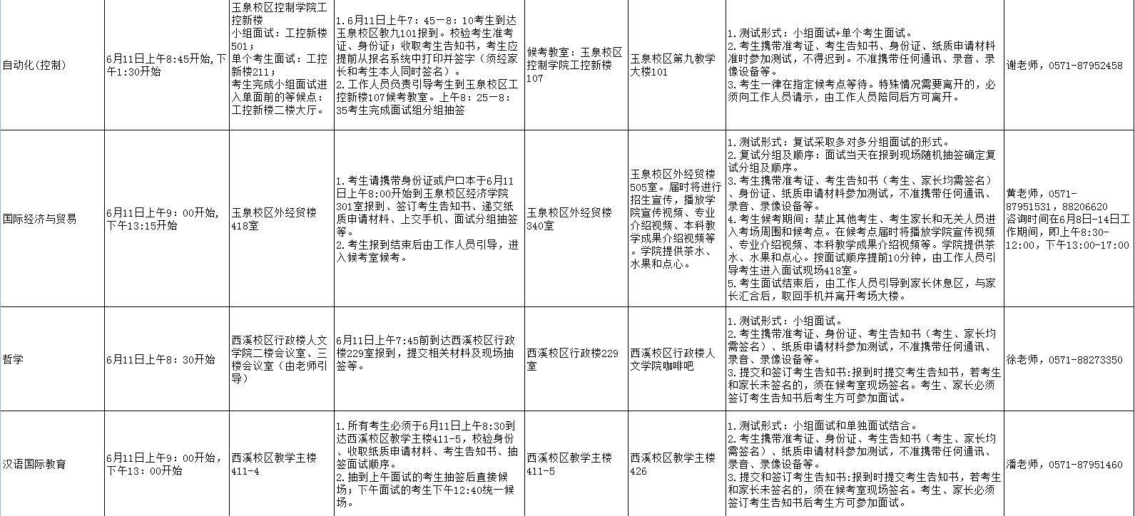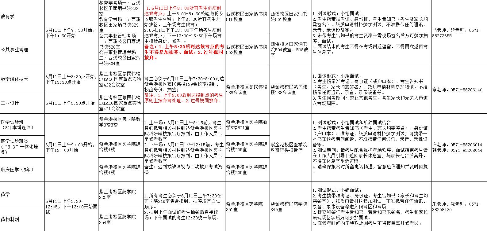2.面试地点:按专业进行面试。各专业面试地点不同,分布在浙江大学紫金港校区、玉泉校区、西溪校区(校区详细地址:紫金港校区--杭州市西湖区余杭塘路866号,玉泉校区--杭州市西湖区浙大路38号,西溪校区--杭州市西湖区天目山路148号),请考生注意面试地点分布,按各专业面试要求准时参加面试。各专业具体面试时间、地点及要求详见下表。