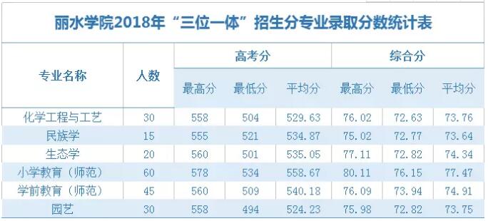 丽水学院2018年“三位一体”招生分专业录取分数情况