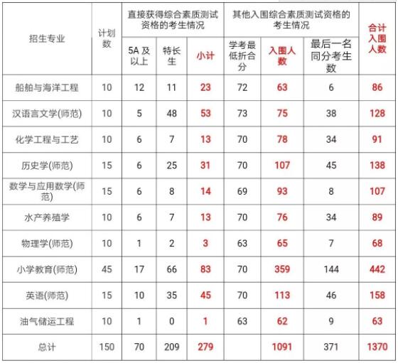 根据浙江省教育考试院有关文件精神和浙江海洋大学2019年“三位一体”综合评价招生章程,学校“三位一体”综合评价招生工作专家委员会对考生提交的书面材料进行了审定,共1370人通过书面评审,获得来本校参加综合素质测试资格。其中279位考生(学考成绩5A及以上考生70人;满足学校章程规定专项条件之一的考生209人)符合优先直接获得本校“三位一体”综合素质测试资格,不占通过书面评审的人数比例。其他通过书面评审考生根据学考成绩折算分从高分到低分专业计划数6倍获得我校“三位一体”综合素质测试资格,最后一名同分考生一并入围,共计1091人,具体如下: