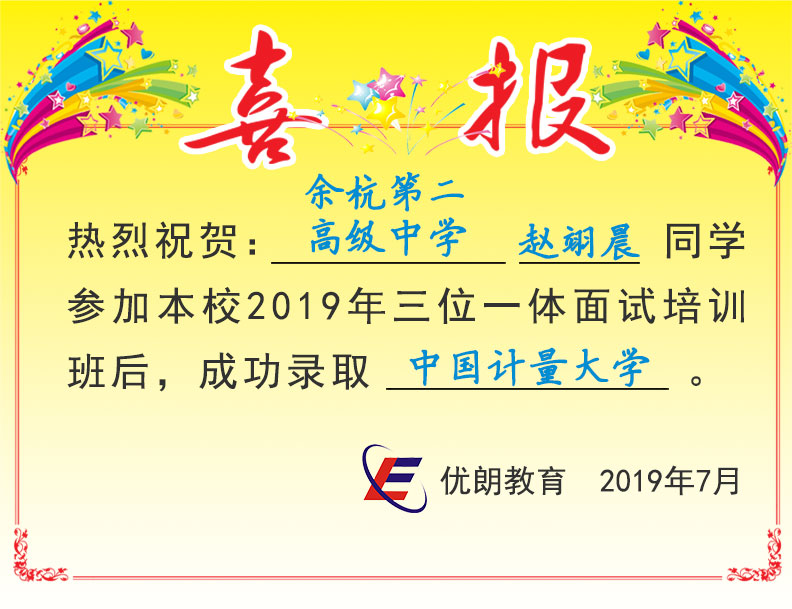 2019喜讯:余杭第二高级中学赵翊晨同学成功录取中国计量大学